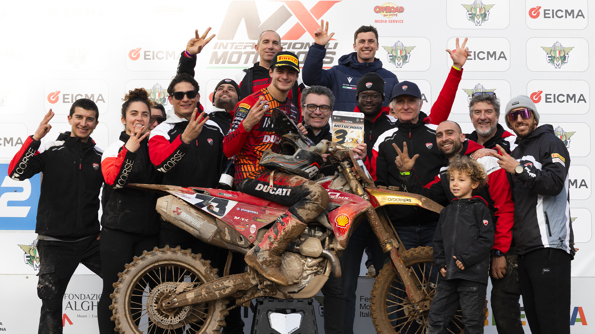 It was a positive day for the Beddini Racing Ducati Corse Factory MX2 Team, which fielded the two Desmo250 MX of Ferruccio Zanchi and Simone Mancini in Alghero. After posting the seventh-fastest time in his group in timed practice, Zanchi came out of the gate in race one with a great start, cornering in third place, immediately taking second, and battling throughout the race with the top riders of the group, setting excellent lap times and finishing second. Mancini's first race, however, was more complicated. He got off to a slow start after posting the ninth fastest time in his group in the morning practice sessions, held in pouring rain, and crashed on the first lap, restarting last. After gaining nearly 20 positions, the number 97 managed to finish 19th, earning two points. Race two got off to a less impressive start, with Zanchi seventh after the first lap and Mancini quickly climbing into the top 10 from fifteenth, managing to finish eleventh. Sixth place earned "Ferro" the third step of the podium, taking home his first trophy of the season and an excellent test ahead of the first round of the world championship.