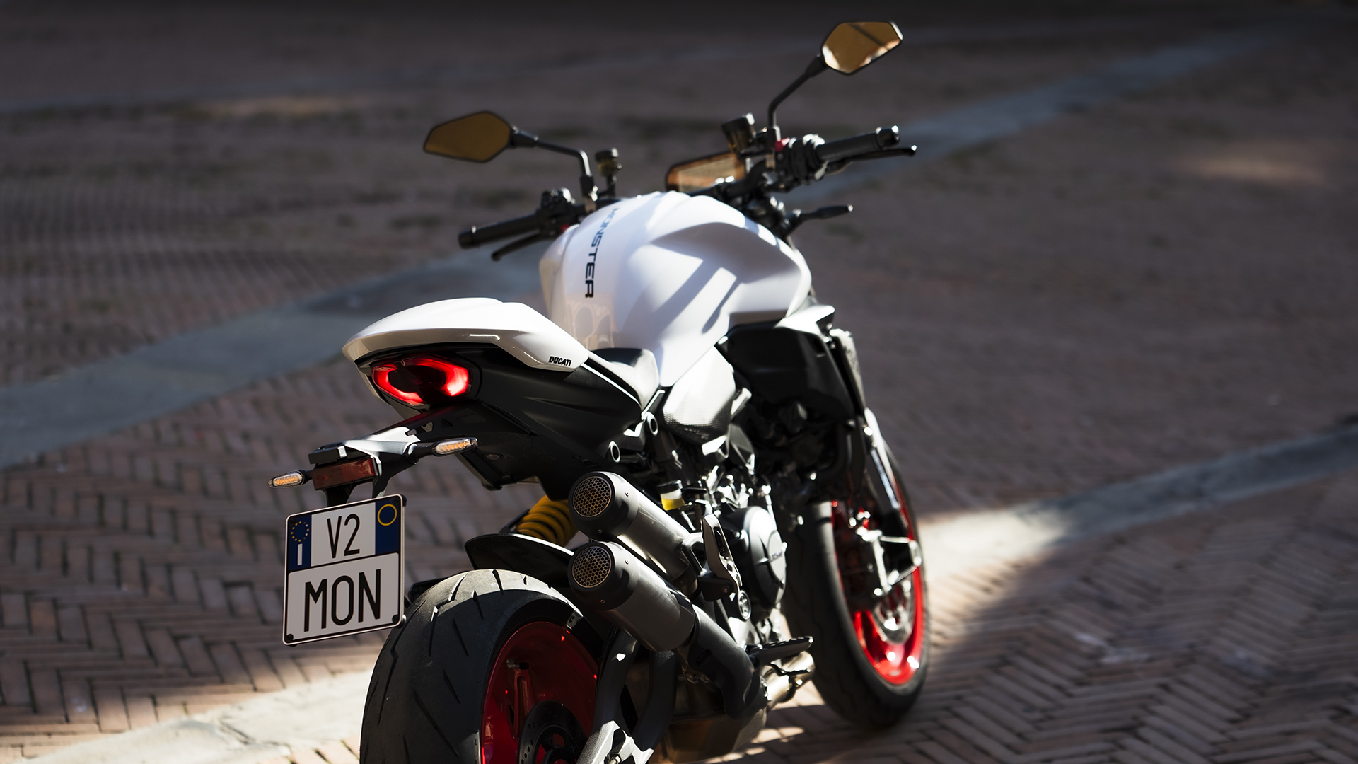 To inspire those who want to make the Monster truly their own, Ducati Performance offers numerous accessories to enhance its aesthetics, such as carbon fiber details or machined aluminum parts, as well as a sport seat with Alcantara upholstery. Sport enthusiasts will also appreciate homologated silencers with titanium sleeves and carbon end caps, developed in collaboration with Termignoni, which reduce weight (-0.2 kg) and unmistakably boost the Monster’s character.