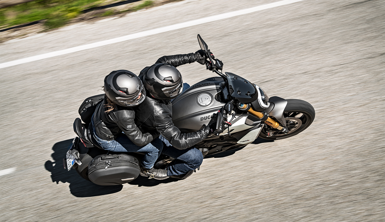 It is a good rule of thumb to take advantage of all the possibilities that the bike has to offer when braving many kilometres as a couple. For example, the Multistrada 1260 offers you the possibility of carrying a 5-litre tank pocket bag, two 26- and 30-litre rigid side bags and a 48-litre top case.